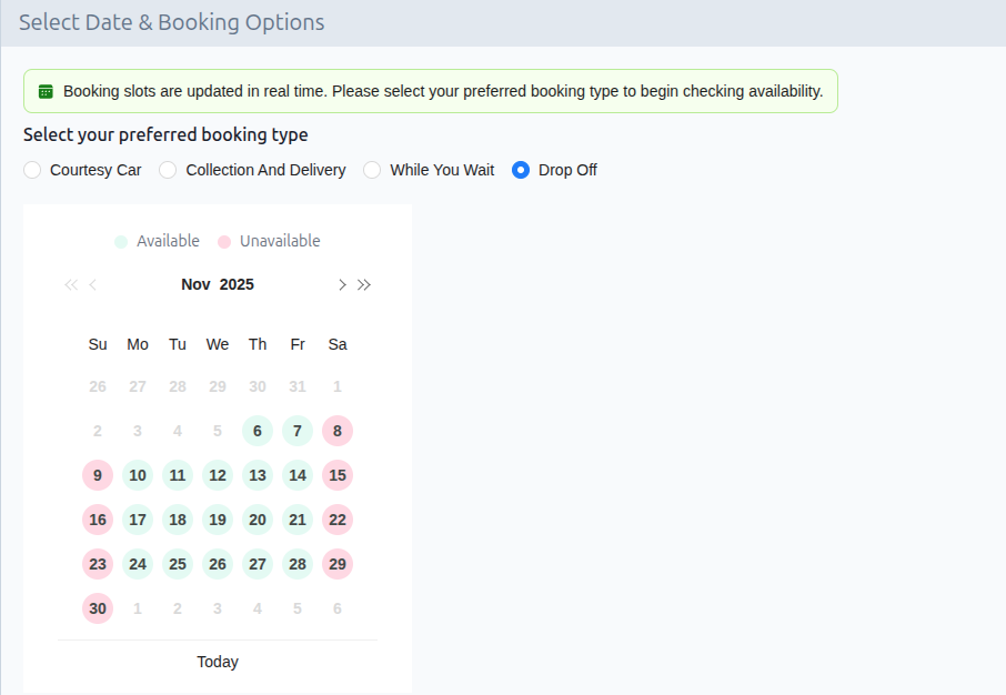 - Platform fetches available dates for the current month for the selected supplier and service type and displays it to the user