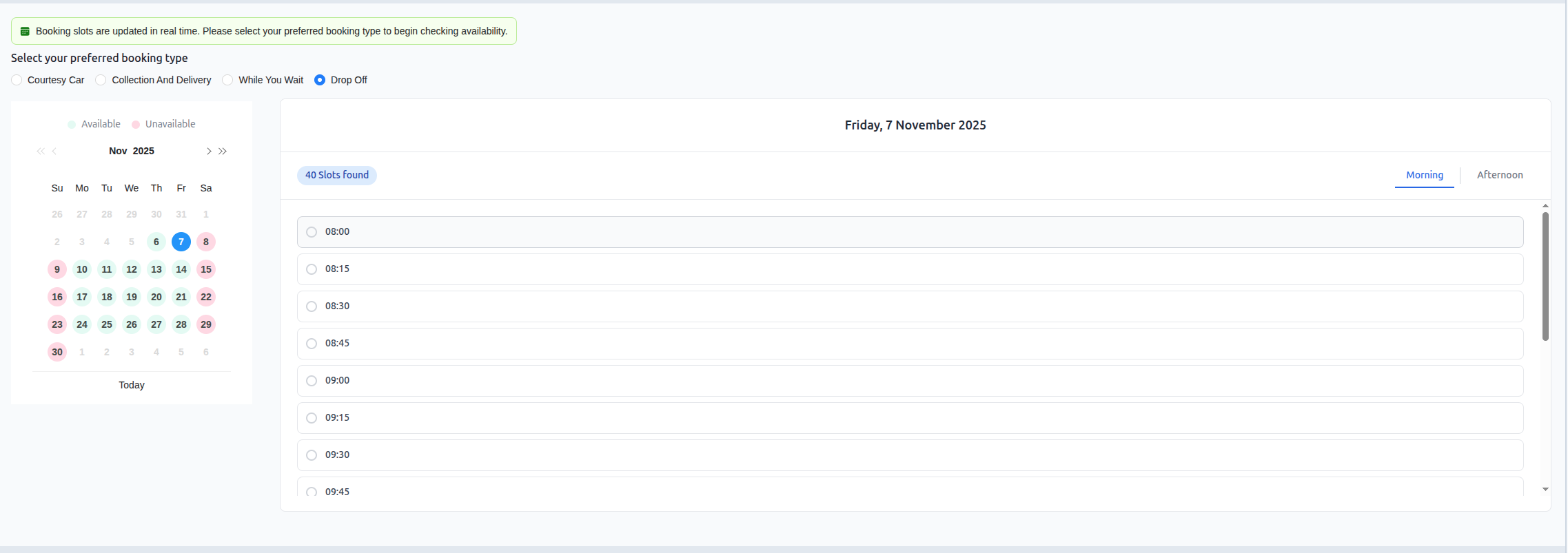Note: If the DMS is down or unreachable when a supplier with DMS integration is selected, the platform will seamlessly revert to the ViSN booking creation process. Users will be able to proceed with booking as usual, but without real-time live diary availability.