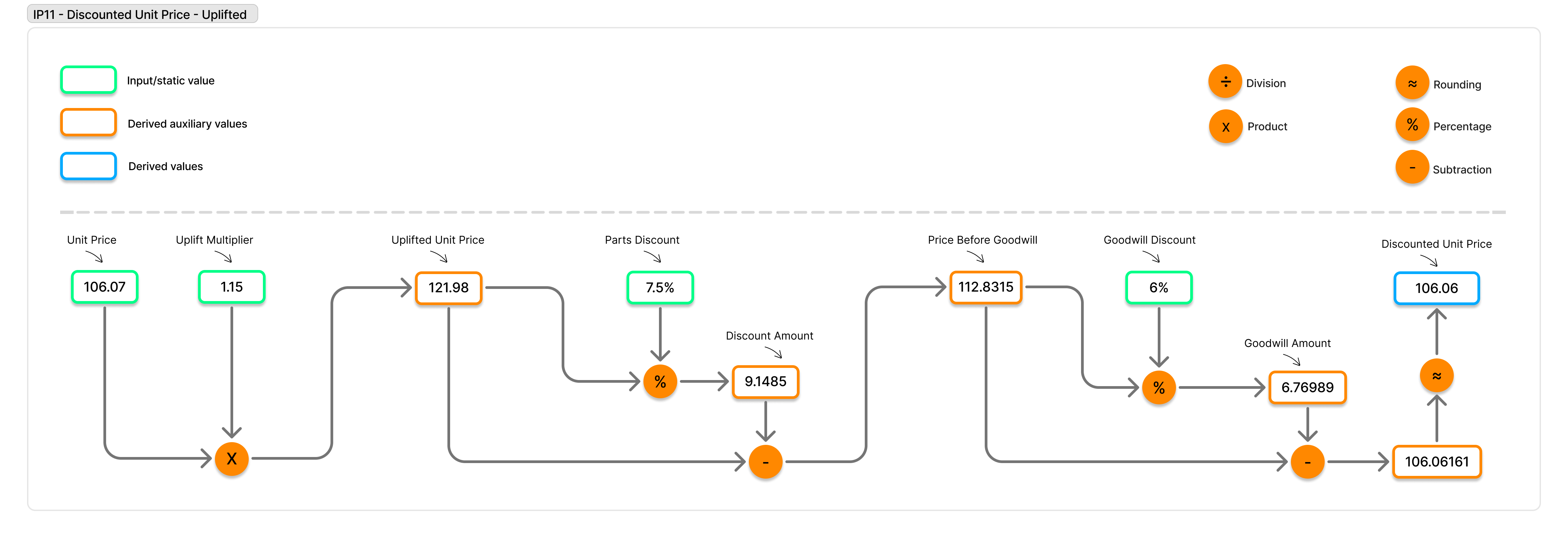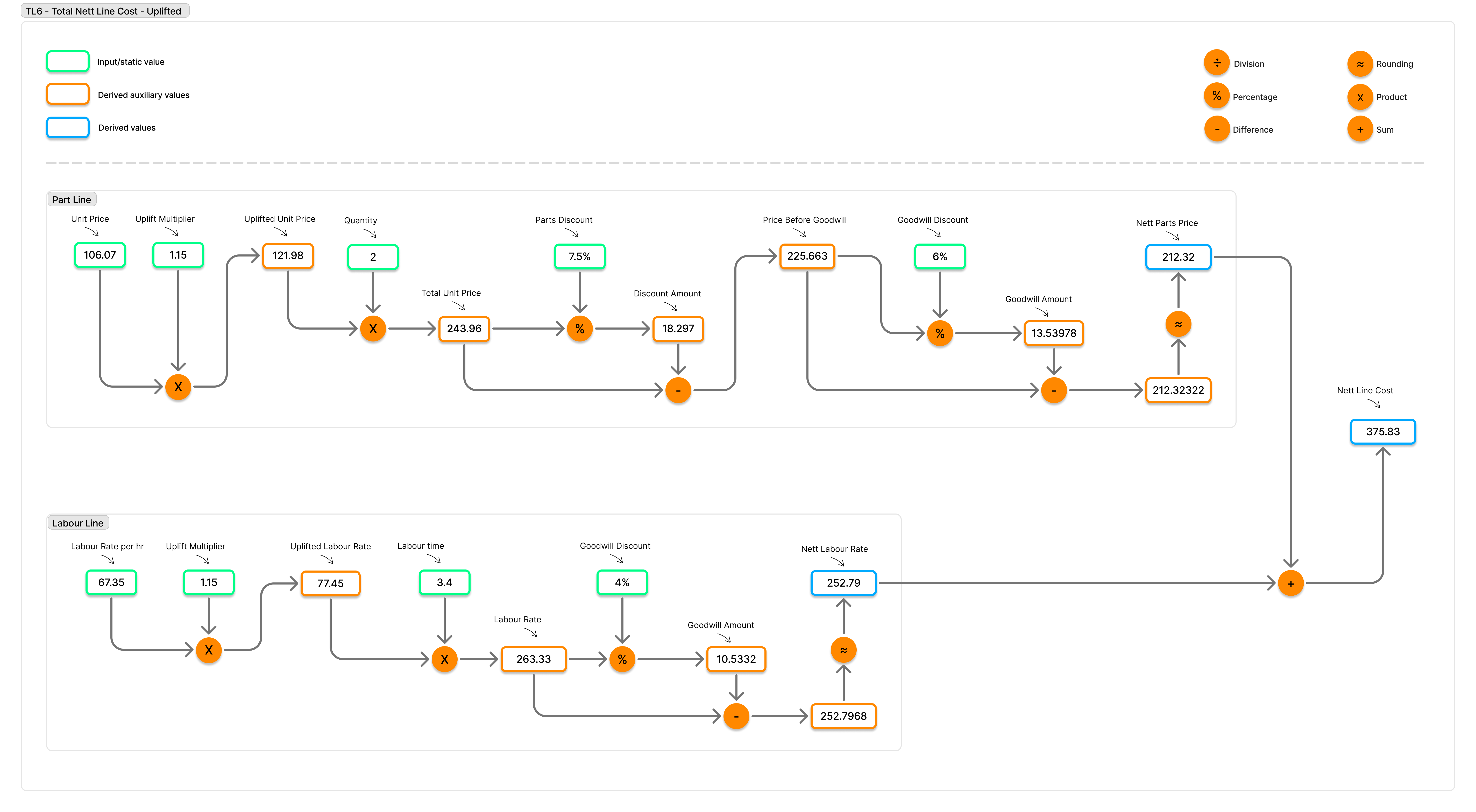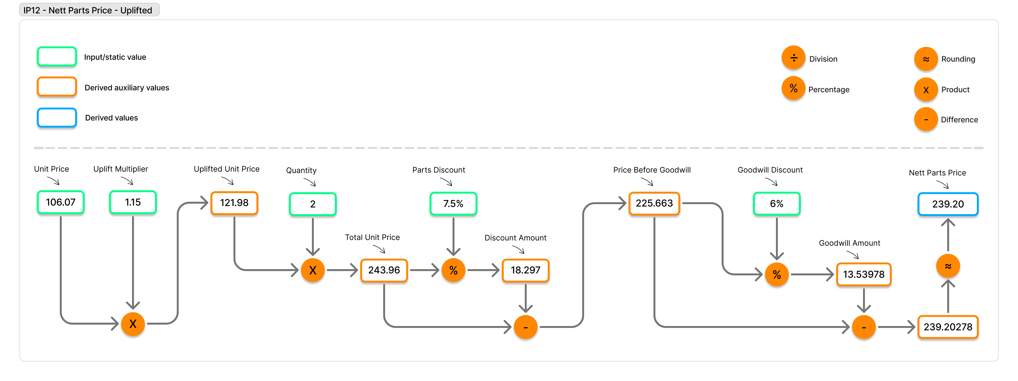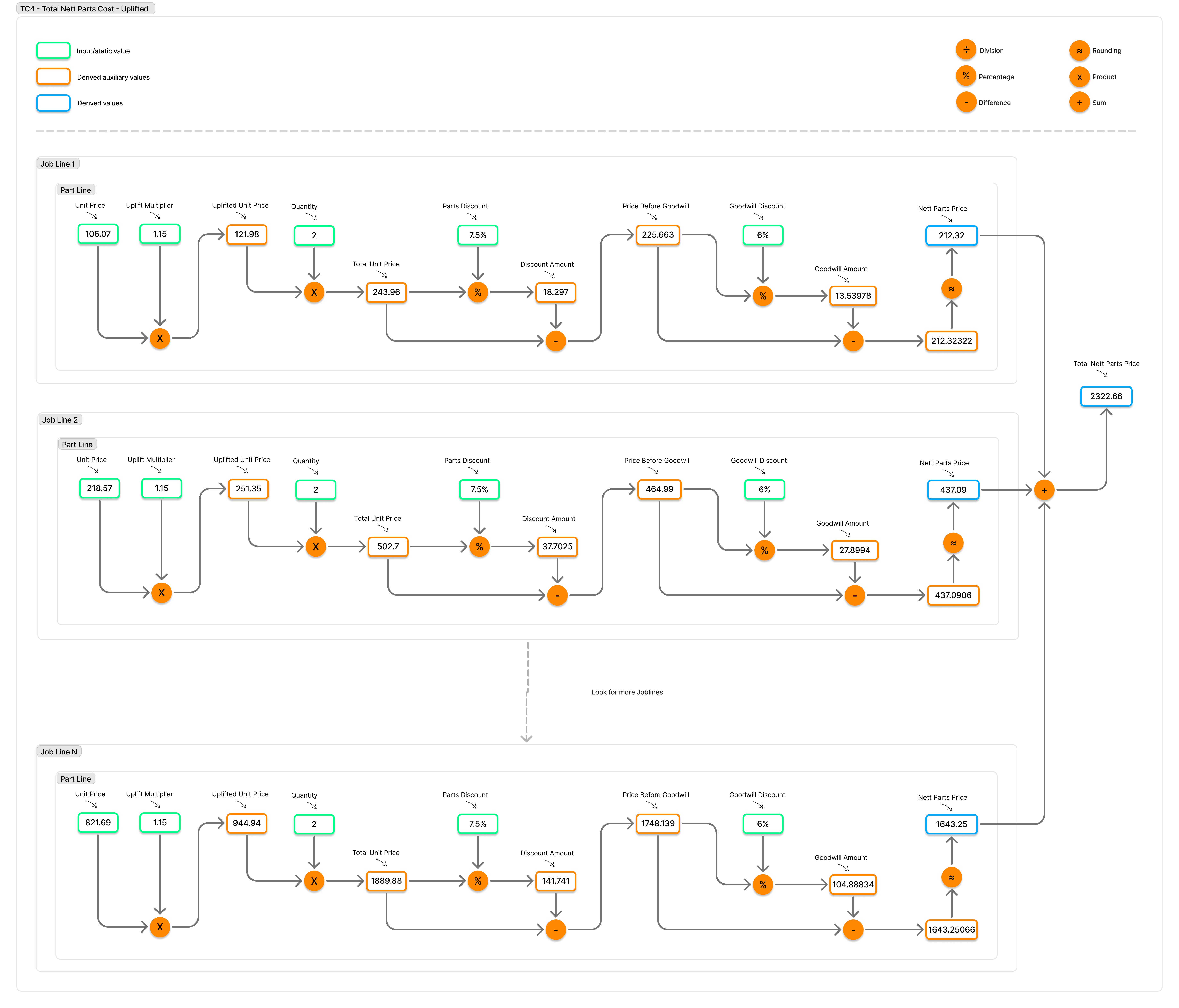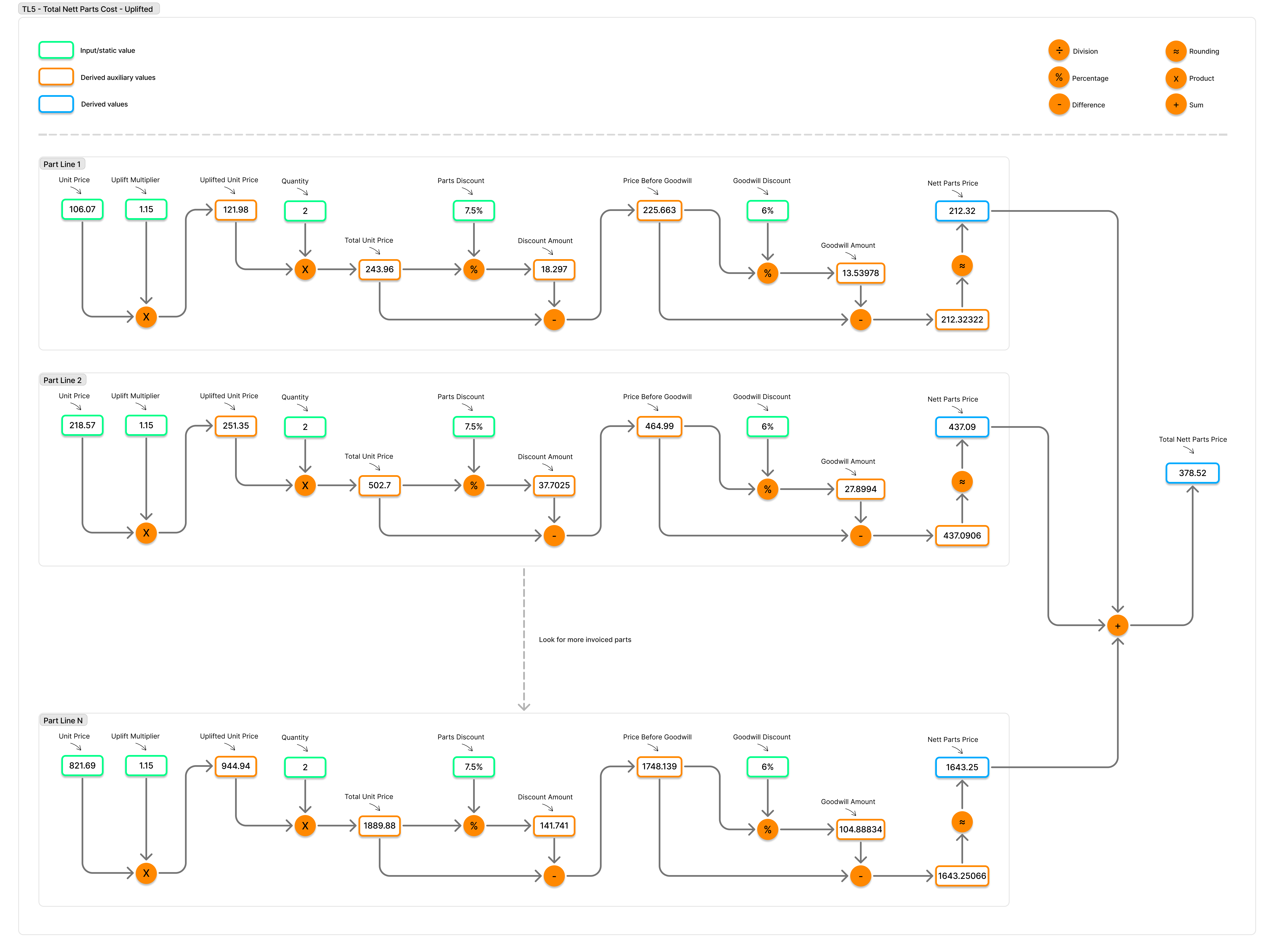 | 12 | Nett Parts Price | Number | 5.2 | The net price is derived by calculating the total cost (unit price multiplied by quantity), then deducting the unit discount and the goodwill discount. No uplift example: