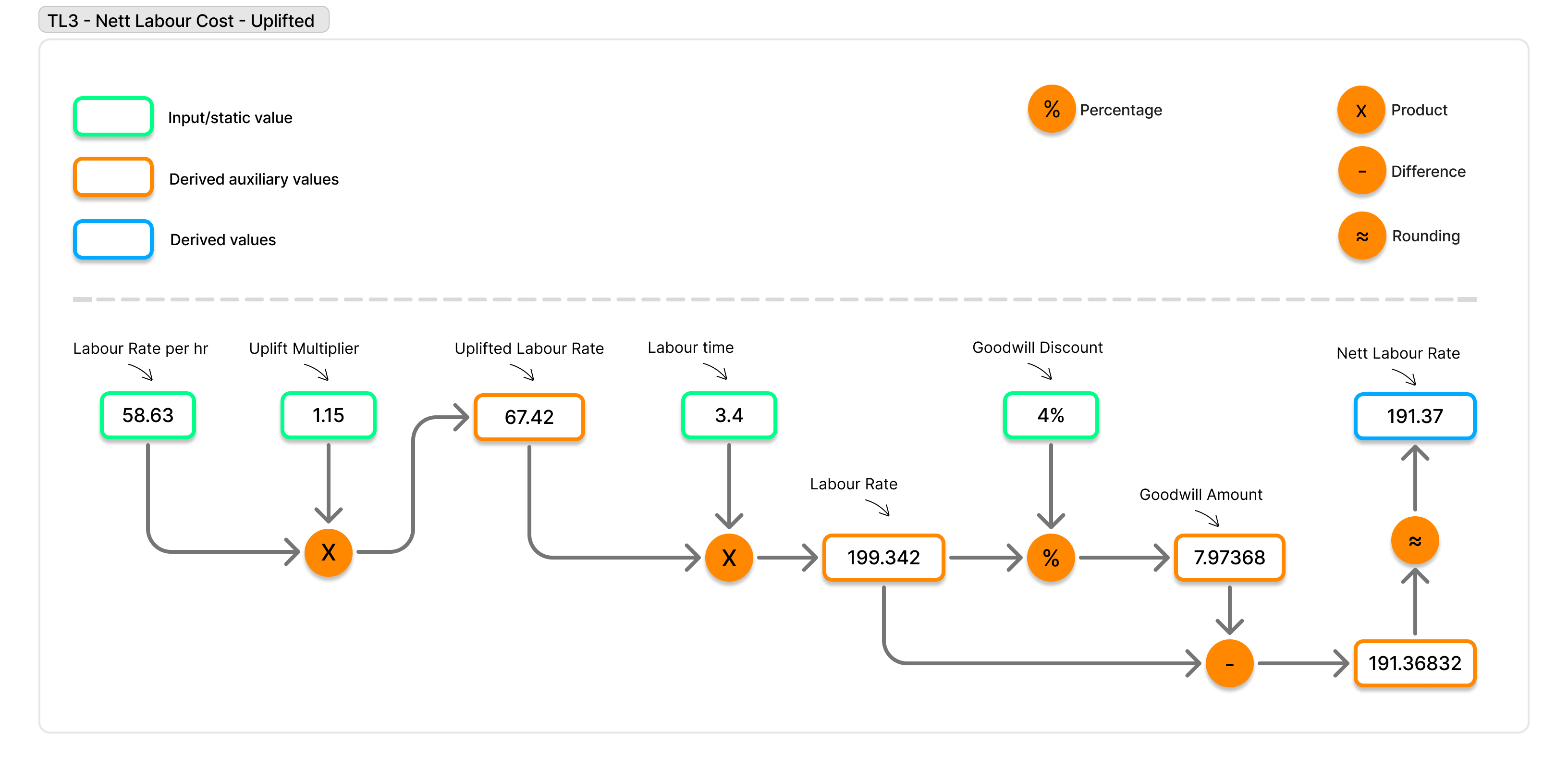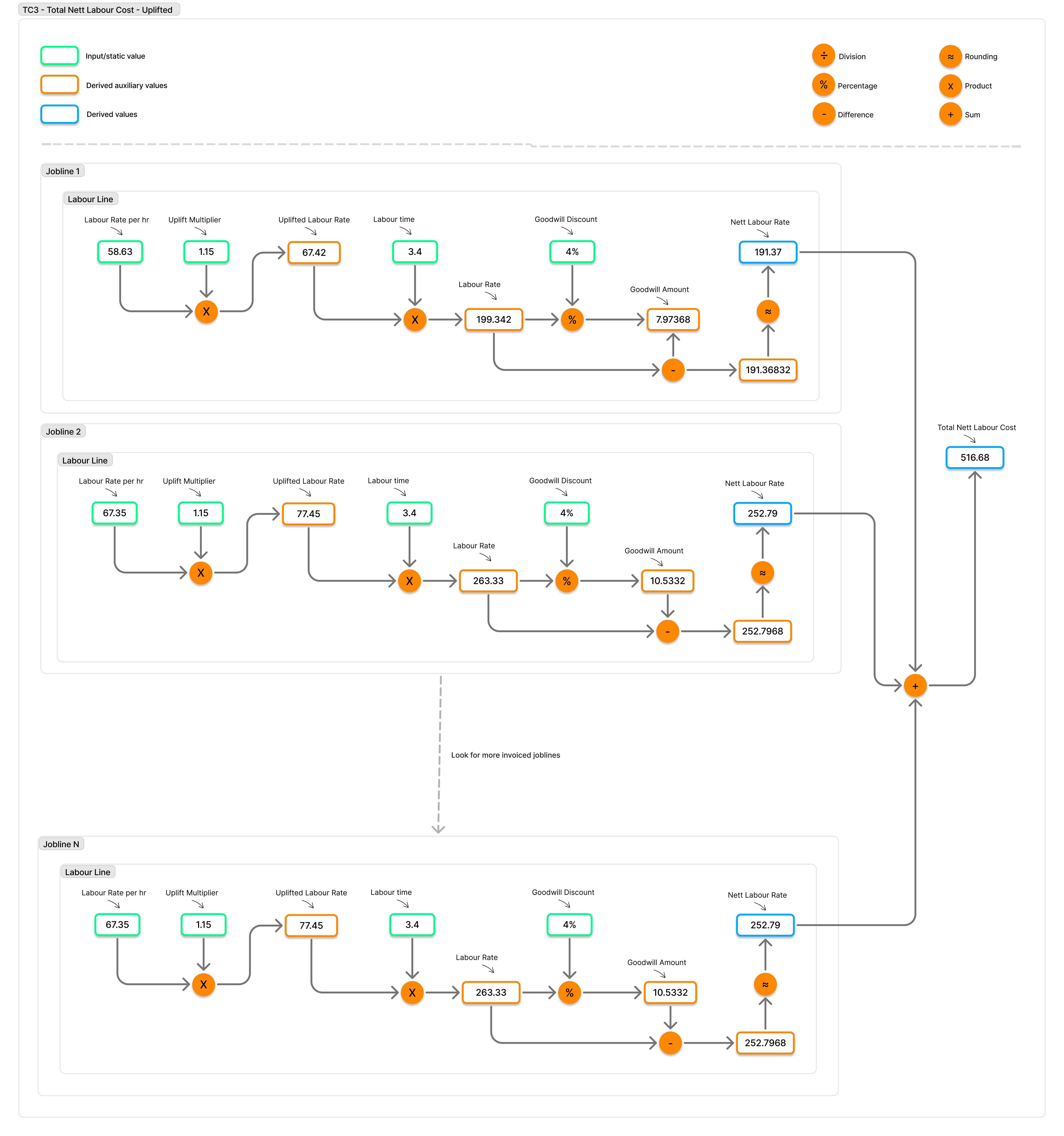 | 3 | Total Nett Labour Cost | Number | 5.2 | (e.g., 99999.99) The value for this field is determined by the job line type and job description type. Refer IL16 to check the same. It is calculated by summing up the net labor costs (TL3) of all job lines in the jobsheet. The net labor cost is determined by considering the labor rate, labor hours, and applying goodwill discount. No uplift example: