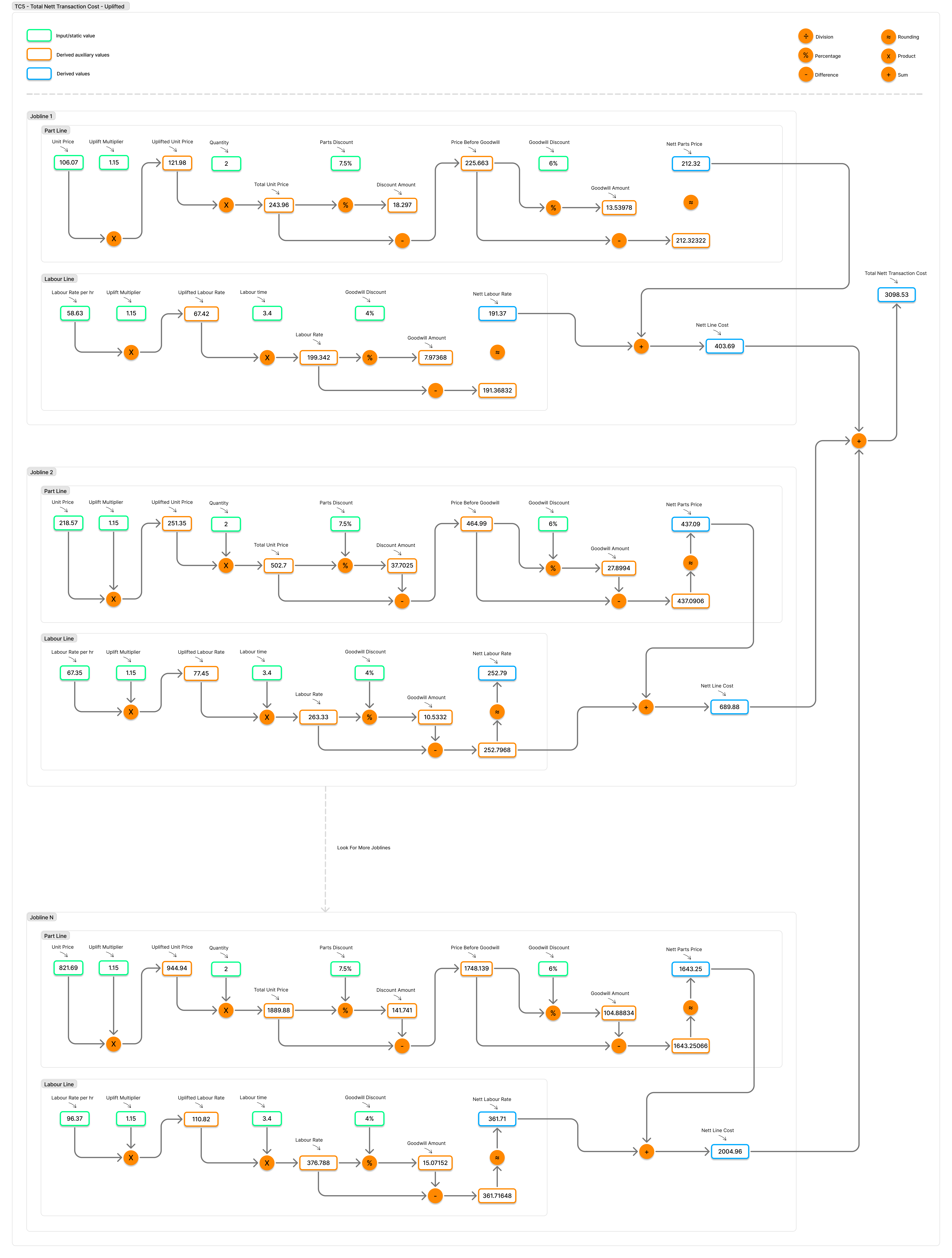 | 5 | Total Nett Transaction Cost | Number | 5.2 | (e.g., 99999.99) This value is calculated by adding up the Total Nett Line Cost (TL6) of all lines in the jobsheet. The Total Nett Line Cost is determined by combining the total net parts cost and the total net labour cost if the job line includes both parts and labour. Otherwise, it represents the total value of the job line. No uplift example: