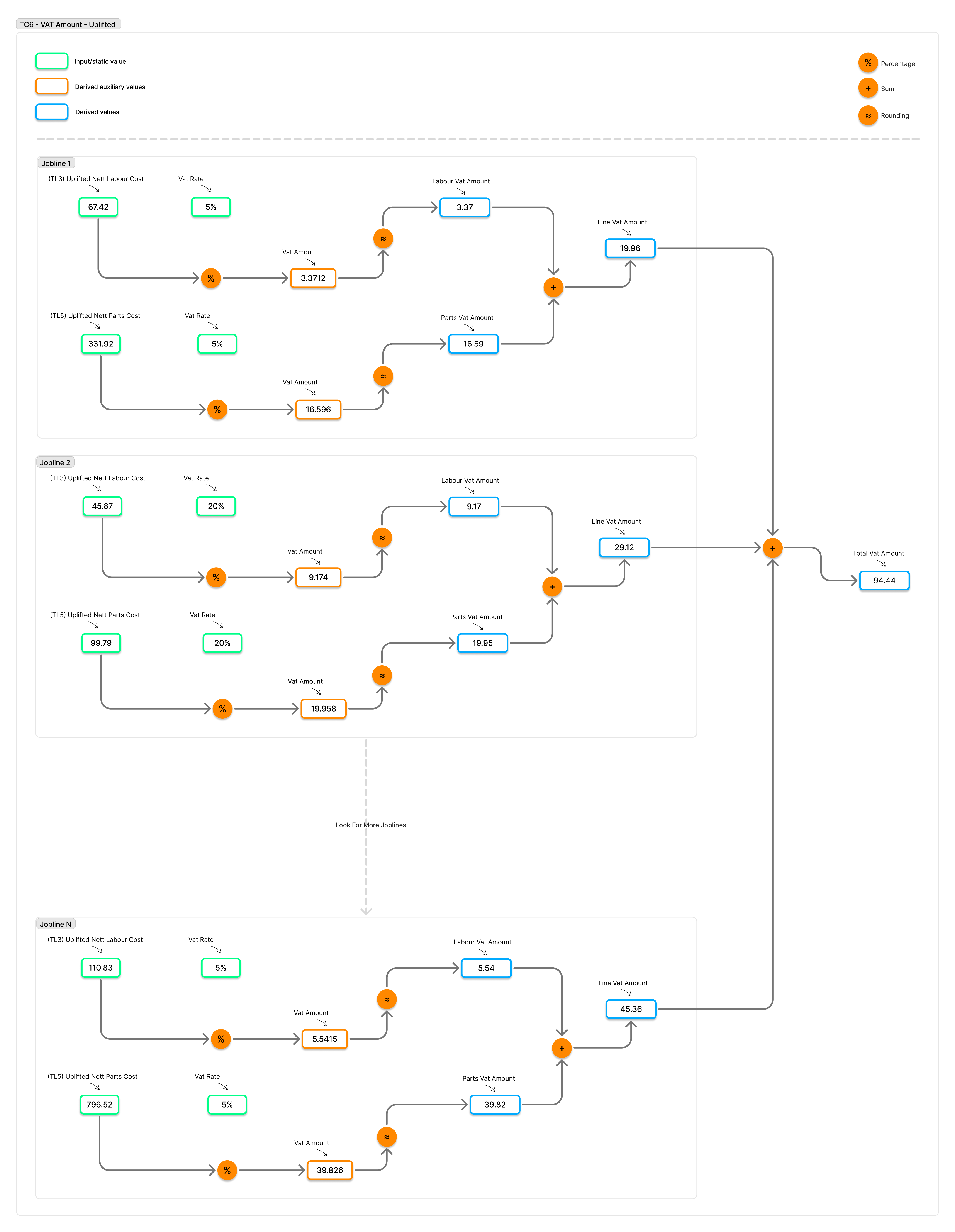 | 4 | VAT Applicable Amount | Number | 5.2 | (e.g., 99999.99) Represents the total cost of all joblines where the specified VAT code is applied. For eligible job lines, this total is calculated using uplifted net parts/labour values (uplift is applied before unit discounts and manufacturer goodwill). No uplift example: VAT Applicable Amount (VA4) = TL6 = 270.00With uplift example (x1.10): VAT Applicable Amount (VA4) = TL6 uplifted = 297.00 | Y |
