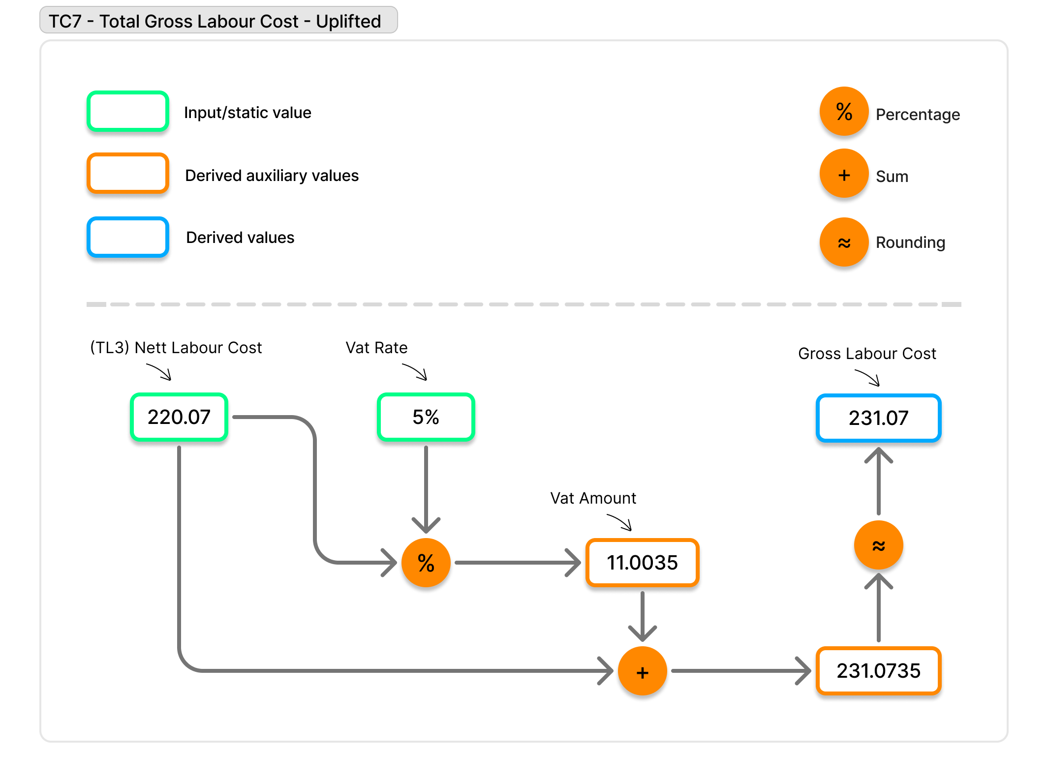 | 7 | Total Gross Labour Cost | Number | 5.2 | (e.g., 99999.99) Mandatory with an invoice or credit note The final value is calculated by factoring in the total net labor cost and applying the VAT rate No uplift example: