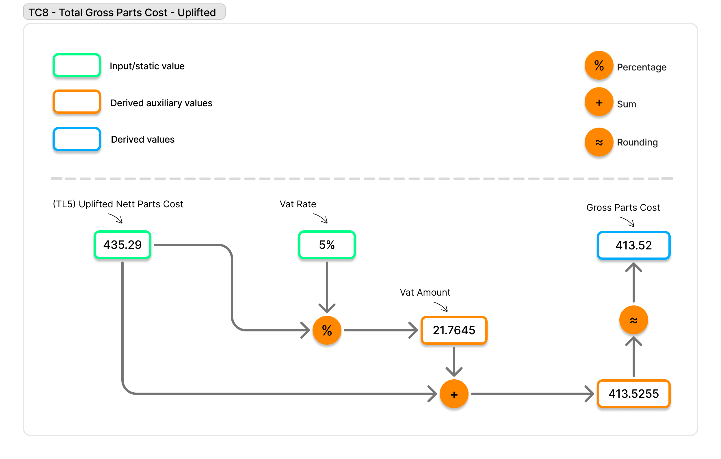 | 8 | Total Gross Parts Cost | Number | 5.2 | (e.g., 99999.99) Mandatory with an invoice or credit note The final value is calculated by factoring in the total net parts cost and applying the VAT rate No uplift example: