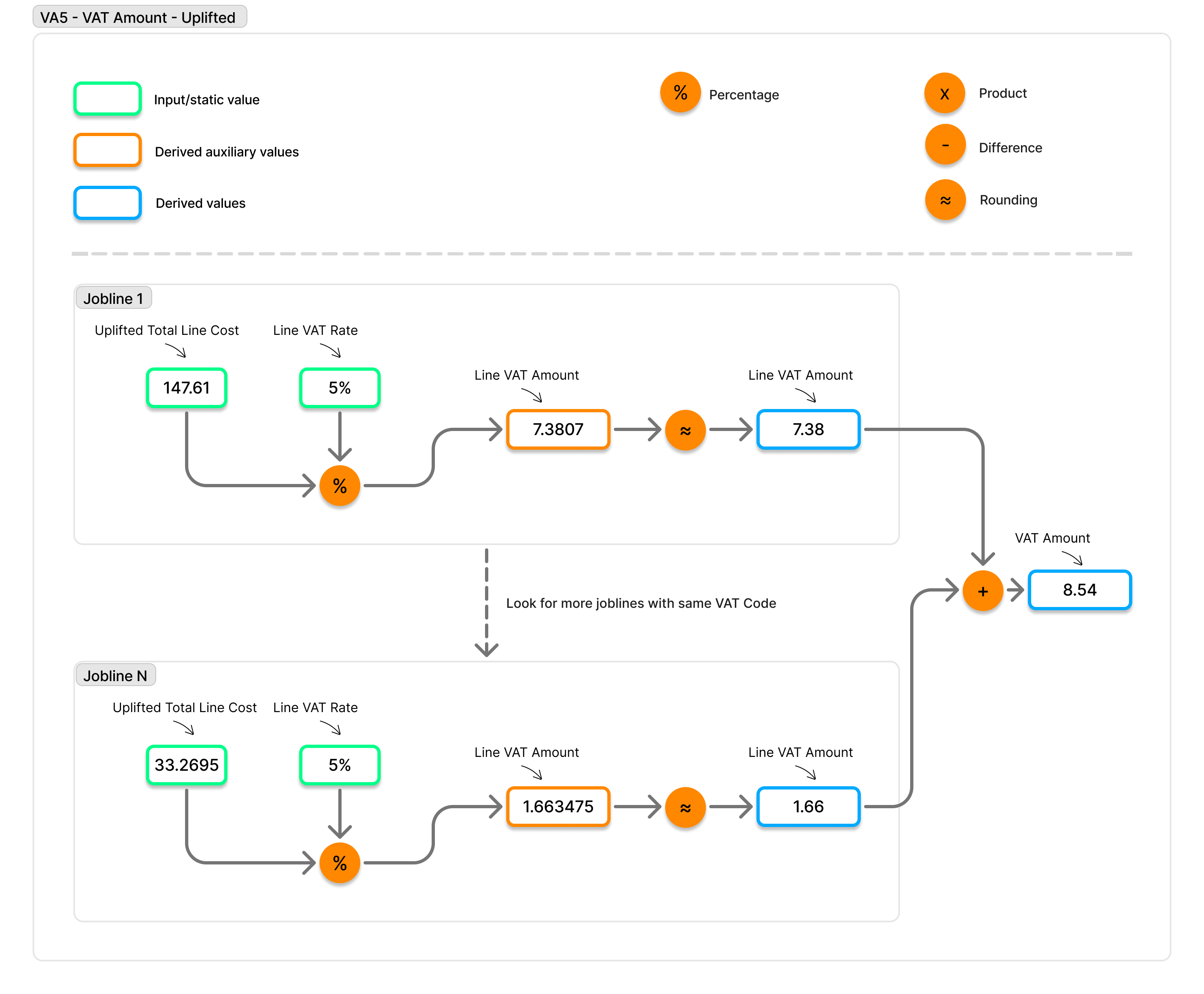 | 6 | VAT Amount | Number | 5.2 | (e.g., 99999.99) This value is calculated by adding up the vat amount of all lines in the jobsheet. No uplift example: