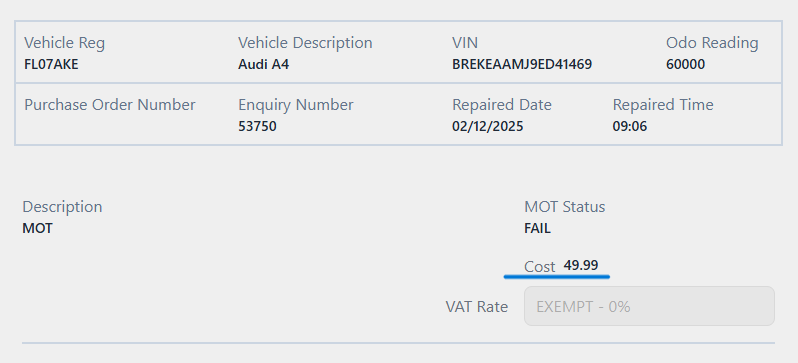 • MOT - Use the VAT rate associated with MOT from the invoice drawer