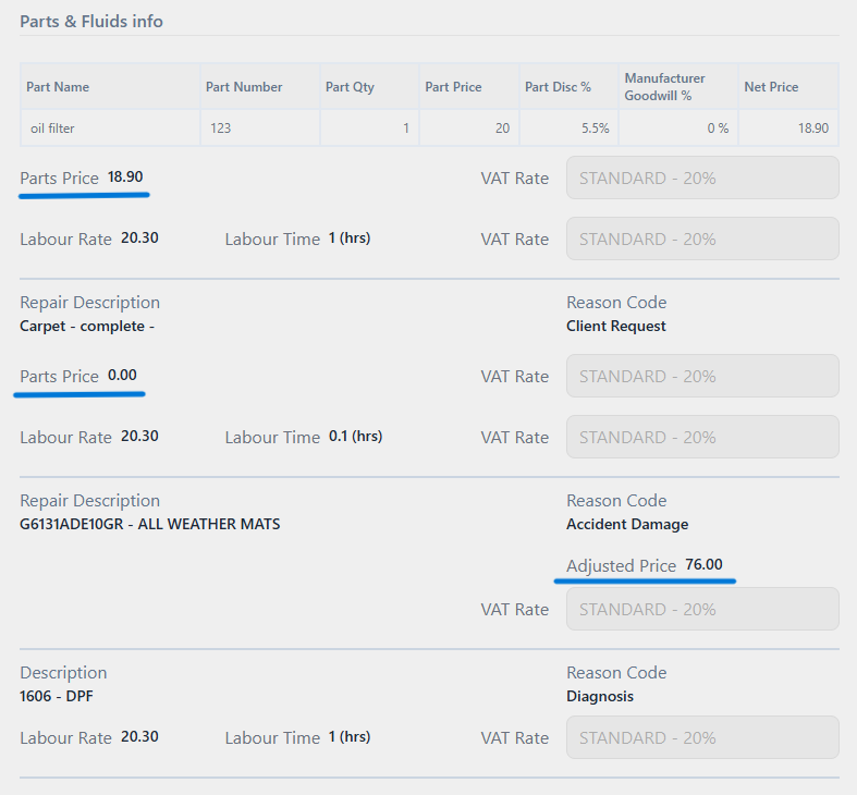 • Parts - Use the VAT rate associated with the Parts value / catalogue value from the invoice drawer