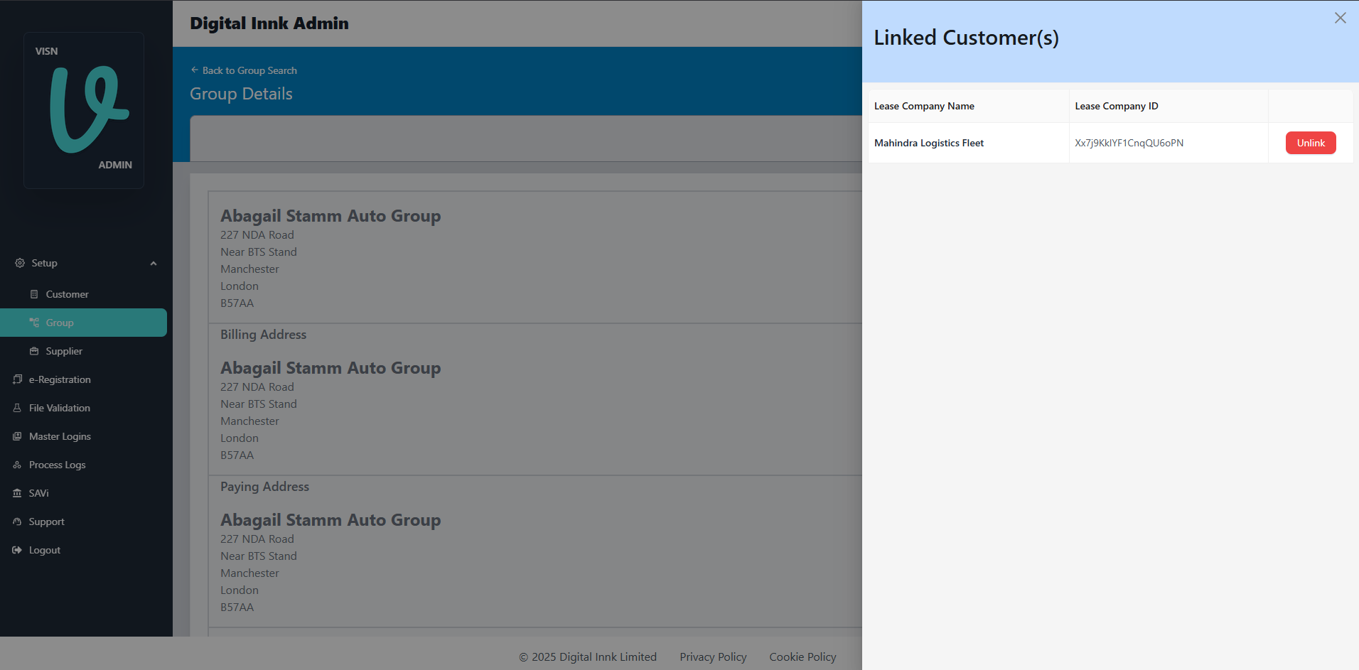 The Linked Customers feature in the view Group Details screen allows DI Admin users to view and manage customers linked to a group. This includes viewing linked customers in a table and removing (unlinking) them with proper updates and event logging.